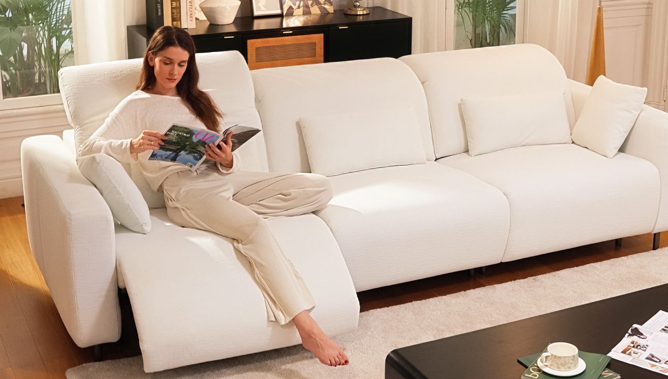 French handcrafted dual power sofa with adjustable headrest, footrest, waterproof chenille fabric, and built-in charger for smart, cloud-like comfort.